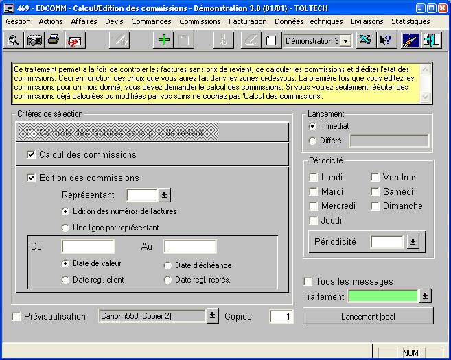 Ecran de lancement du calcul et de l'édition des commissions. Ces deux tâches pouvant être faites séparément.
