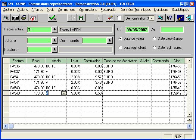 o Saisissez les dates de sélection (obligatoires). Déterminez ensuite à quoi elles correspondent : aux dates de valeur (création de la facture en général), d'échéance (calculée dès la création de la facture), de règlement client (saisie dans le tableau détail), de règlement représentant (saisie dans le tableau détail)